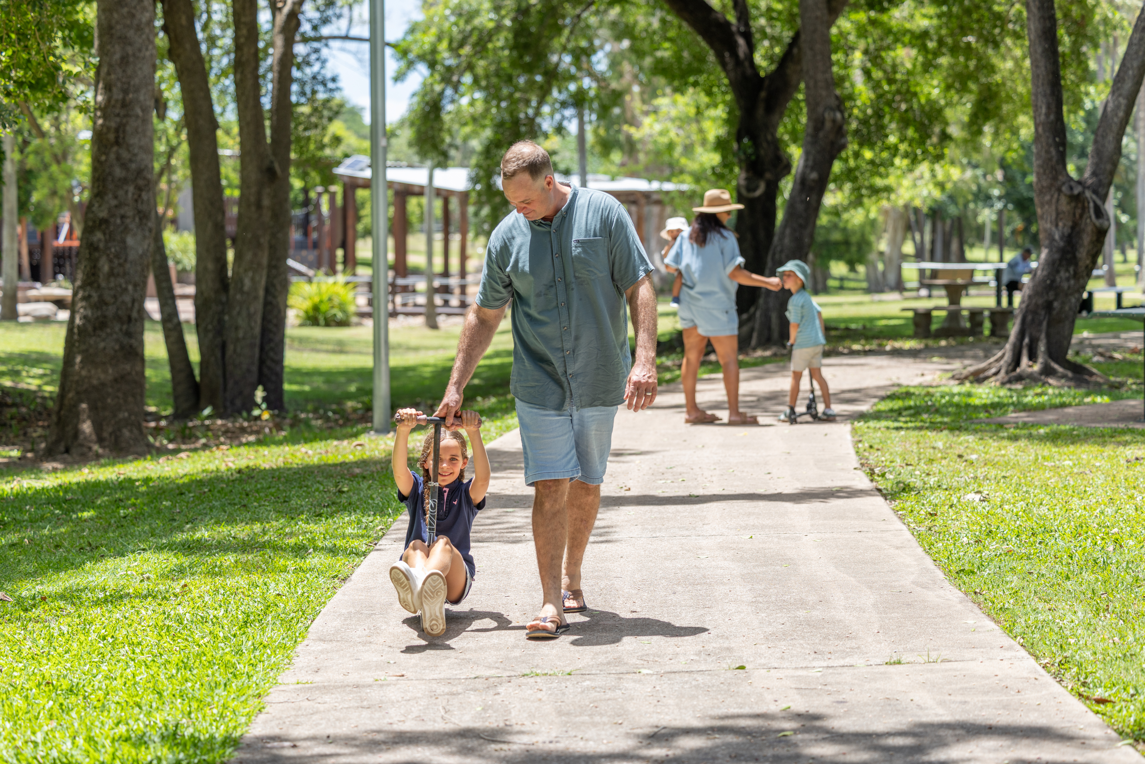 The park is home to the state‑of‑the‑art Plantation Nature Play, a spacious play area designed to suit children of all ages. It is a state-of-the-art nature-based play area with all-abilities swings, a fortress-themed lookout, and rock and rope climbs. While the area is not fenced, it includes picnic tables and seating nearby, making it easy for families to relax while kids explore and play.